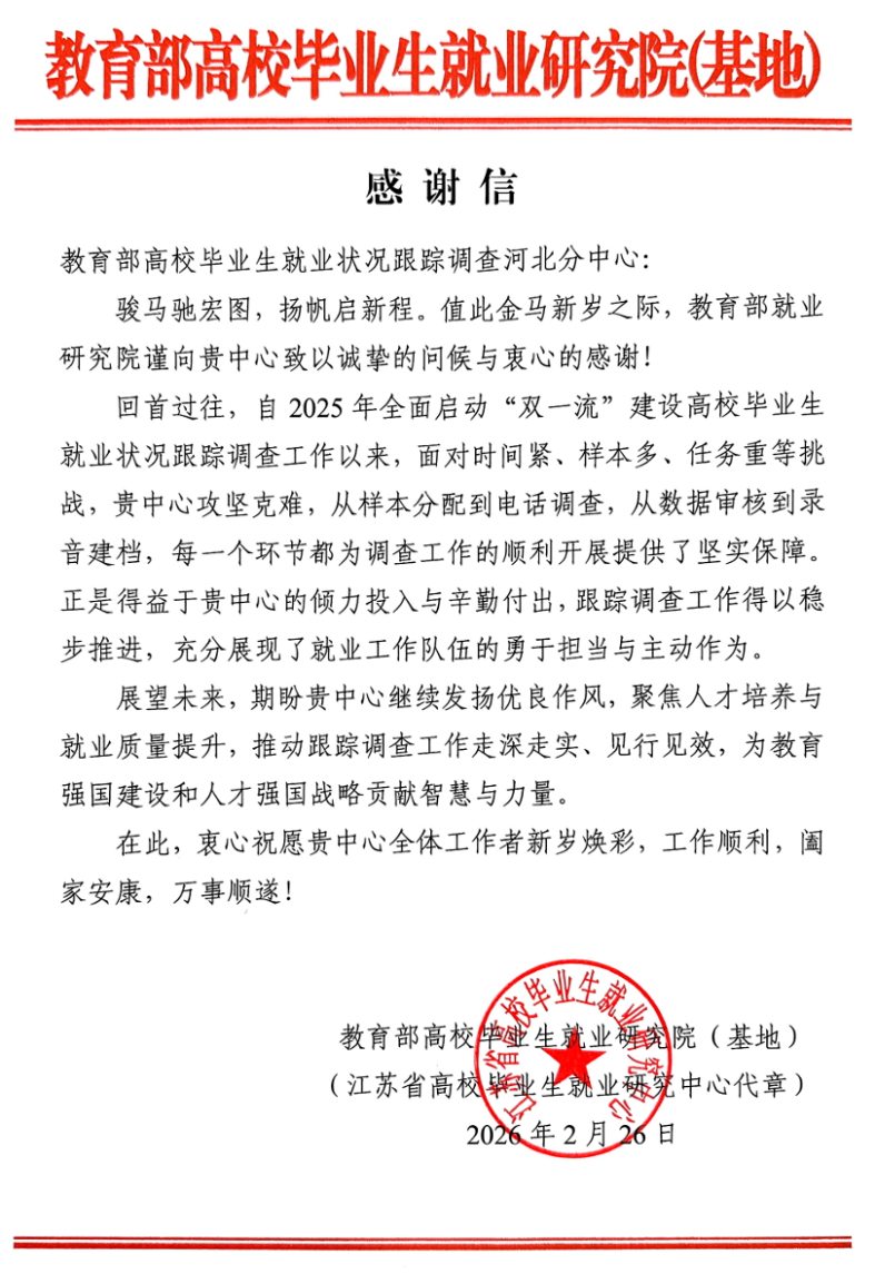 近日,教育部高校毕业生就业研究院向学校发来感谢信,对本校承担的2025年“双...