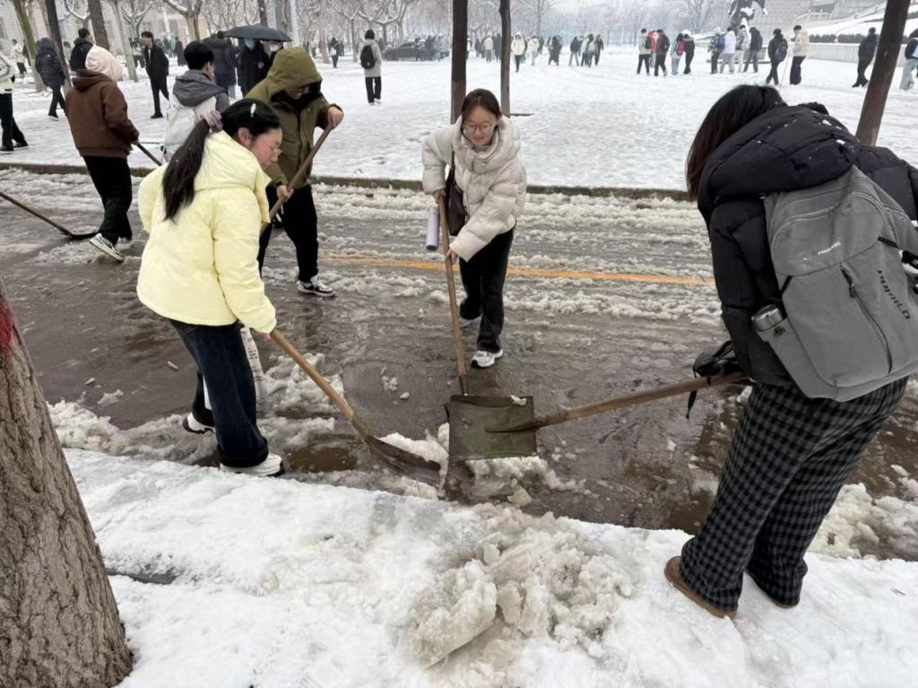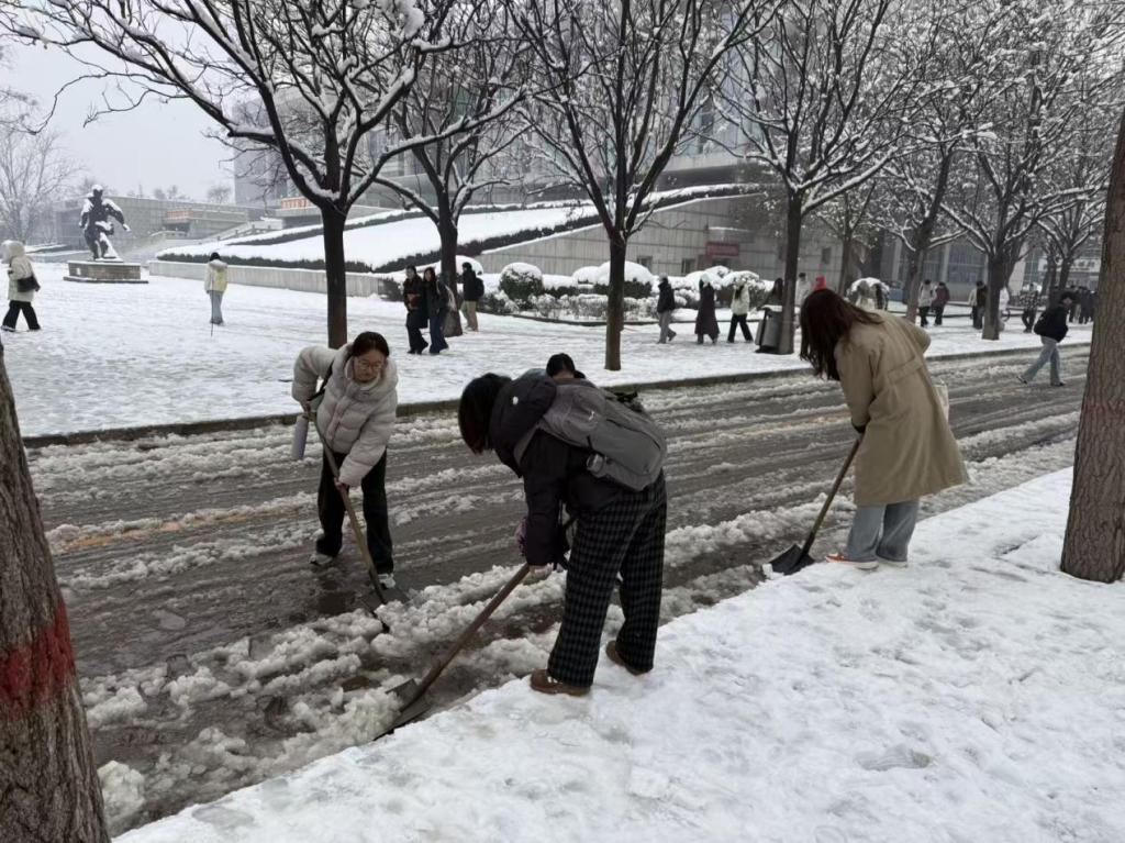 活动中,志愿者们热情高涨、分工协作,手持铁锹、扫帚等工具,对学院劳动教育实践区域的路段展开全面清理。大家不畏严寒、干劲十足,铲冰、扫雪、归堆等环节衔接有序,配合默契。凛冽寒风中,志愿者们忙碌的身影与皑皑白雪交相辉映,构成校园里一道温暖而充满力量的风景线。经过近两小时的共同奋战,主要路段积雪冰层被彻底清除,为师生开辟出一条安全通畅的"平安路"。